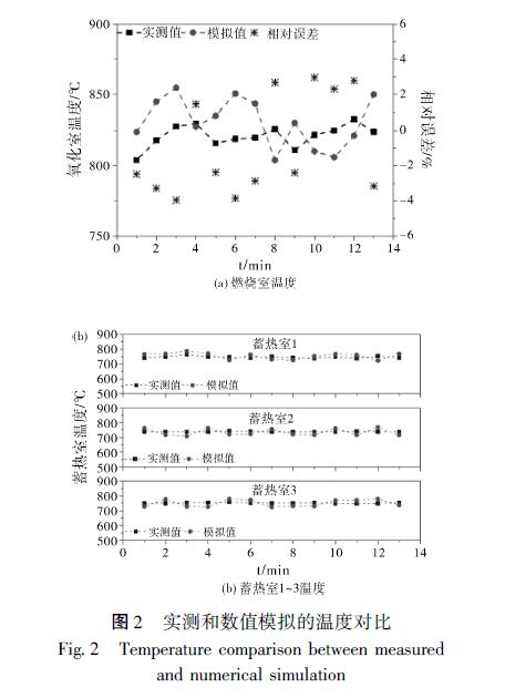 在連續(xù)監(jiān)測穩(wěn)定運行階段多個切換周期后, 將燃燒室三個熱電偶及變送器監(jiān)測的爐膛溫度值計算得到平均值, 同時將每個蓄熱室中的出口位置熱電偶的溫度值進行記錄, 圖2 為同一測點的工程實際數(shù)據(jù)與數(shù)值模擬值的對比。通過對比, 得到溫度模擬數(shù)據(jù)與實際監(jiān)測值的相對誤差均在4% 以內(nèi), 這也可能