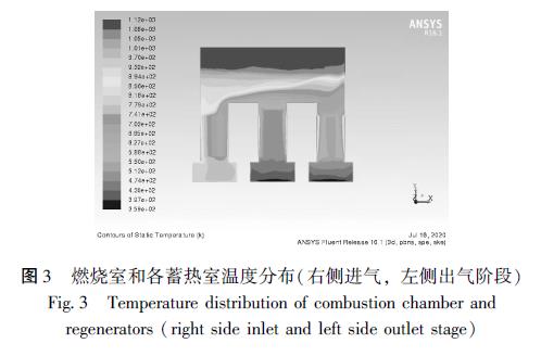 量, 因此在豎直方向蓄熱體和氣體都呈現(xiàn)出明顯的溫度梯度。同時, 當進氣排氣方向發(fā)生變化時, 燃燒室內(nèi)溫度也會出現(xiàn)波動, 且分布不均勻。對于燃燒室結(jié)構(gòu), 也有裝置將燃燒室頂部兩側(cè)的直角改為切角, 使得煙氣湍流充分, 減小低溫區(qū)出現(xiàn)的可能性